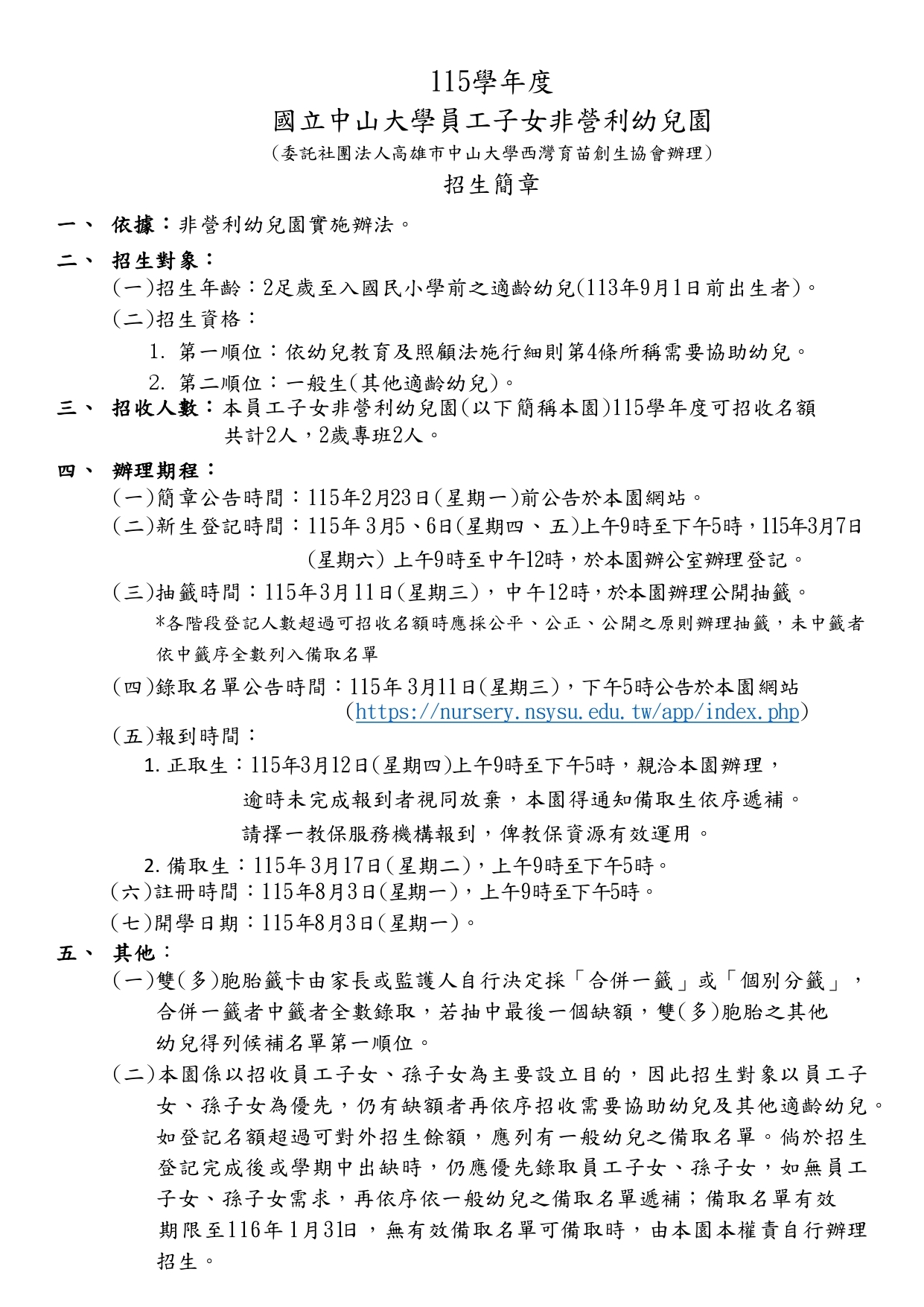 國立中山大學員工子女非營利幼兒園(委託社團法人高雄市中山大學西灣育苗創生協會辦理)